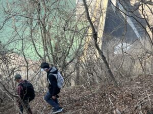 頂上からあのダムの貯水池まで降りていきます。