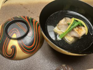 メインの伊勢海老・フォアグラの和栗スープ炊きを楓のお皿で