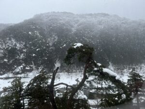 部屋の広縁には懐かしの掘りごたつがあって、部屋の電気を消してそこから雄大なモノクロの風景を楽しみます。ここ、料金も手頃だし来年の冬もまた来たいなぁ。
